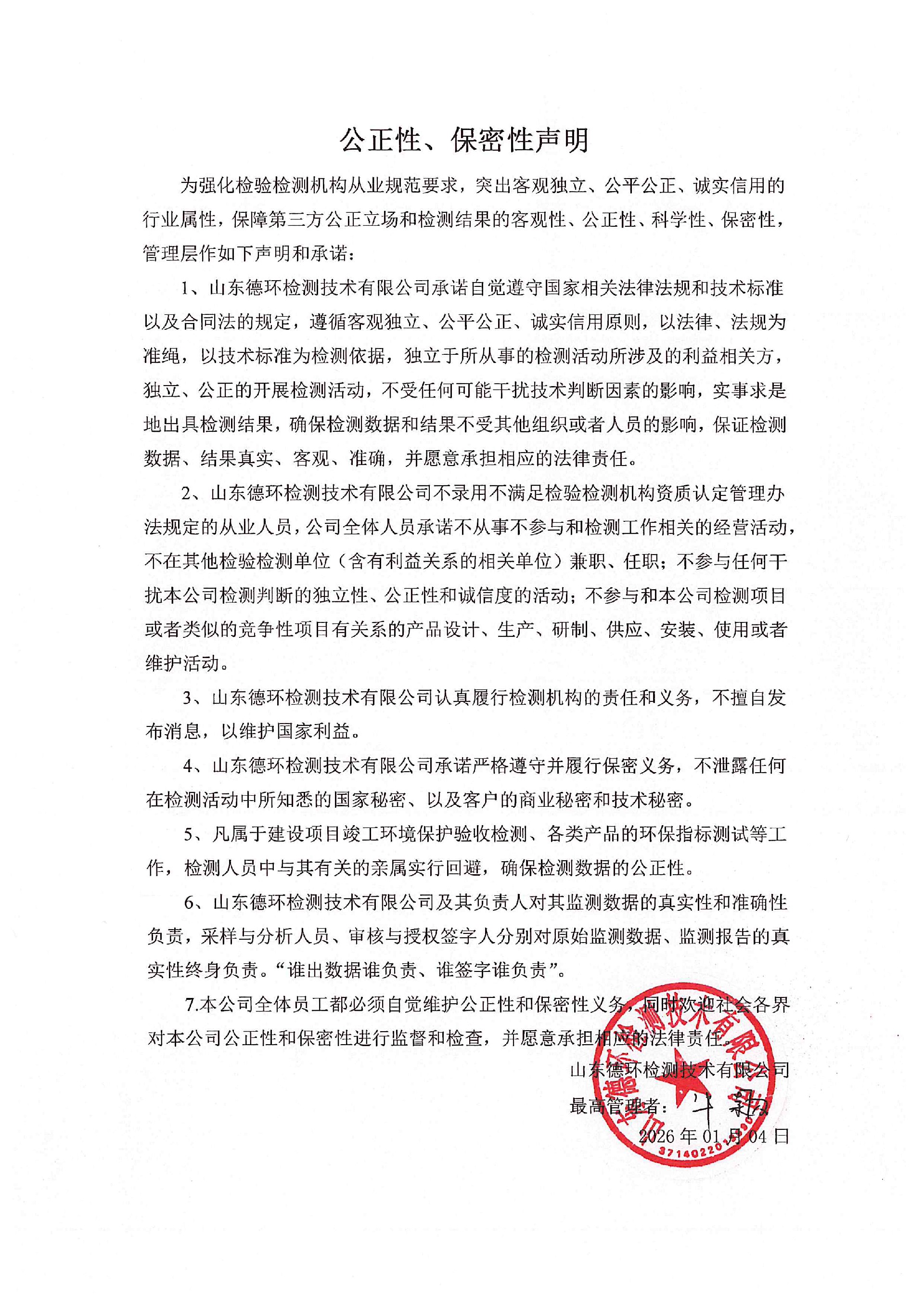 為強(qiáng)化檢驗(yàn)檢測(cè)機(jī)構(gòu)從業(yè)規(guī)范要求,突出客觀獨(dú)立、公平公正、誠(chéng)實(shí)信用的行業(yè)屬性,保障第三方公正立場(chǎng)和檢測(cè)結(jié)果的客觀性、公正性、科學(xué)性、保密性,管理層作如下聲明和承諾: 1、山東德環(huán)檢測(cè)技術(shù)有限公司承諾自覺(jué)遵守國(guó)家相關(guān)法律法規(guī)和技術(shù)標(biāo)準(zhǔn)以及合同法的規(guī)定,遵循客觀獨(dú)立、公平公正、誠(chéng)實(shí)信用原則,以法律、法規(guī)為準(zhǔn)繩,以技術(shù)標(biāo)準(zhǔn)為檢測(cè)依據(jù),獨(dú)立于所從事的檢測(cè)活動(dòng)所涉及的利益相關(guān)方,獨(dú)立、公正的開(kāi)展檢測(cè)活動(dòng),不受任何可能干擾技術(shù)判斷因素的影響,實(shí)事求是地出具檢測(cè)結(jié)果,確保檢測(cè)數(shù)據(jù)和結(jié)果不受其他組織或者人員的影響,保證檢測(cè)數(shù)據(jù)、結(jié)果真實(shí)、客觀、準(zhǔn)確,并愿意承擔(dān)相應(yīng)的法律責(zé)任。 2、山東德環(huán)檢測(cè)技術(shù)有限公司不錄用不滿(mǎn)足檢驗(yàn)檢測(cè)機(jī)構(gòu)資質(zhì)認(rèn)定管理辦法規(guī)定的從業(yè)人員,公司全體人員承諾不從事不參與和檢測(cè)工作相關(guān)的經(jīng)營(yíng)活動(dòng),不在其他檢驗(yàn)檢測(cè)單位(含有利益關(guān)系的相關(guān)單位)兼職、任職;不參與任何干擾本公司檢測(cè)判斷的獨(dú)立性、公正性和誠(chéng)信度的活動(dòng);不參與和本公司檢測(cè)項(xiàng)目或者類(lèi)似的競(jìng)爭(zhēng)性項(xiàng)目有關(guān)系的產(chǎn)品設(shè)計(jì)、生產(chǎn)、研制、供應(yīng)、安裝、使用或者維護(hù)活動(dòng)。 3、山東德環(huán)檢測(cè)技術(shù)有限公司認(rèn)真履行檢測(cè)機(jī)構(gòu)的責(zé)任和義務(wù),不擅自發(fā)布消息,以維護(hù)國(guó)家利益。 4、山東德環(huán)檢測(cè)技術(shù)有限公司承諾嚴(yán)格遵守并履行保密義務(wù),不泄露任何在檢測(cè)活動(dòng)中所知悉的國(guó)家秘密、以及客戶(hù)的商業(yè)秘密和技術(shù)秘密。 5、凡屬于建設(shè)項(xiàng)目竣工環(huán)境保護(hù)驗(yàn)收檢測(cè)、各類(lèi)產(chǎn)品的環(huán)保指標(biāo)測(cè)試等工作,檢測(cè)人員中與其有關(guān)的親屬實(shí)行回避,確保檢測(cè)數(shù)據(jù)的公正性。 6、山東德環(huán)檢測(cè)技術(shù)有限公司及其負(fù)責(zé)人對(duì)其監(jiān)測(cè)數(shù)據(jù)的真實(shí)性和準(zhǔn)確性負(fù)責(zé),采樣與分析人員、審核與授權(quán)簽字人分別對(duì)原始監(jiān)測(cè)數(shù)據(jù)、監(jiān)測(cè)報(bào)告的真實(shí)性終身負(fù)責(zé)。“誰(shuí)出數(shù)據(jù)誰(shuí)負(fù)責(zé)、誰(shuí)簽字誰(shuí)負(fù)責(zé)”。 7.本公司全體員工都必須自覺(jué)維護(hù)公正性和保密性義務(wù),同時(shí)歡迎社會(huì)各界對(duì)本公司公正性和保密性進(jìn)行監(jiān)督和檢查,并愿意承擔(dān)相應(yīng)的法律責(zé)任。 山東德環(huán)檢測(cè)技術(shù)有限公司 2026年01月04日 微信圖片_20260104090332.jpg